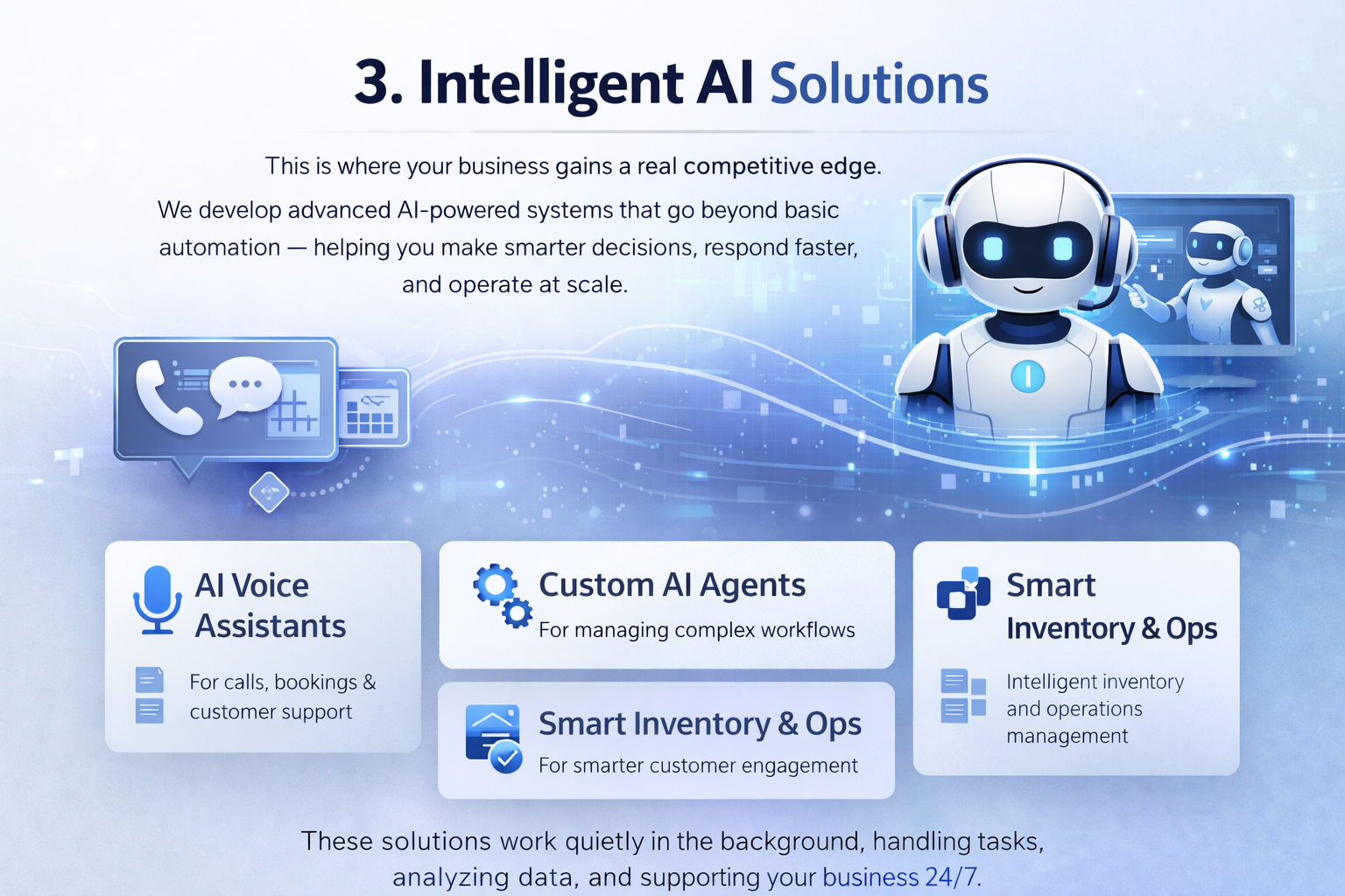 Our advanced AI solutions: voice automation with AI phone assistants for appointments and support, plus custom AI agents for workflows, inventory, and CRM integration.